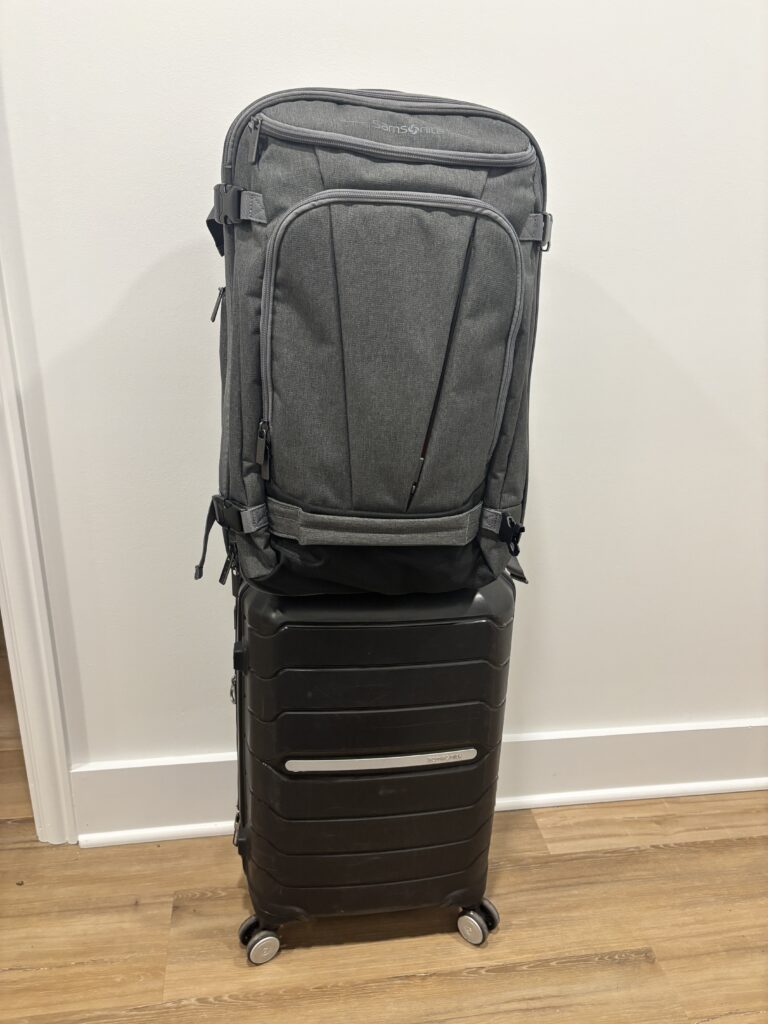 When we want to be hands-free or headed to places that wheels aren’t preferred such as cobblestone paved Europe we like a backpack that functions like a suitcase. We use these bags because they don’t feel like a deep cavern to dig through. Instead, they open like a book. The main compartment holds two medium cubes so you can pack similarly to the hard-side but with a little less space. The MotherLode Jr, which I prefer for the smaller size, fits under the seat. So it’s small enough to be considered your “personal item.” This means you can carry both this and your roller carry-on for your domestic flight.  Note: This bag was originally made by eBag, which was bought by Samsonite recently. We have both versions and happy with Samsonite’s upgrade to add a trolley strap to help it sit effortlessly on the roller suitcase!)